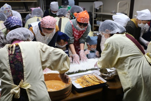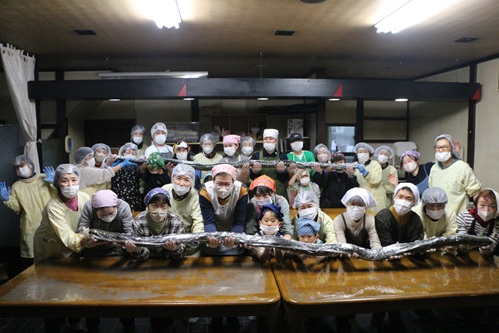 JAひだ助けあい組織「山びこの会」清見支部は12月14日(日)、活動拠点の「あい・あい館」で、園児から高齢者まで19名が参加する、なが~い太巻き作りの交流会を開きました。