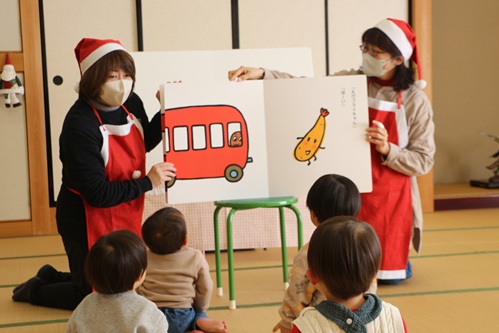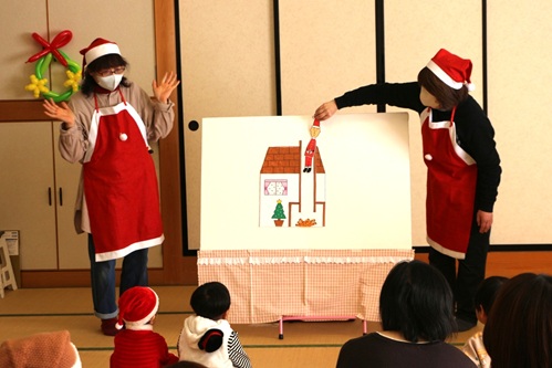 児童センターの「おでかけ隊」のお二人による手遊びやミニ工作、サンタさんのパネルシアターに大型絵本など、親子で楽しめる企画が続き、会場は笑顔であふれていました。